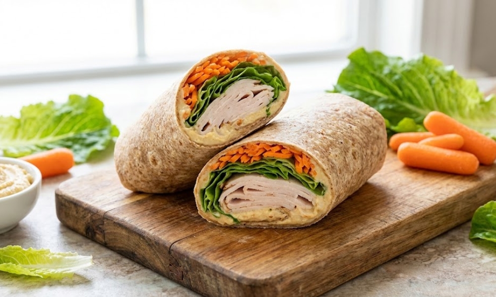 Na tortilju namažite sloj humusa. Dodajte listove zelene salate, tanko sečenu ćuretinu (dimljenu ili pečenu) i rendanu šargarepu.
