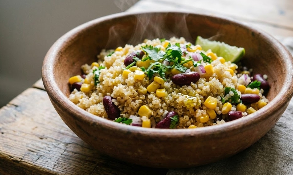 Kinoa se kuva 12-15 minuta. Pomešajte kuvanu kinou sa kukuruzom šećercem, crvenim pasuljem iz konzerve i malo maslinovog ulja.