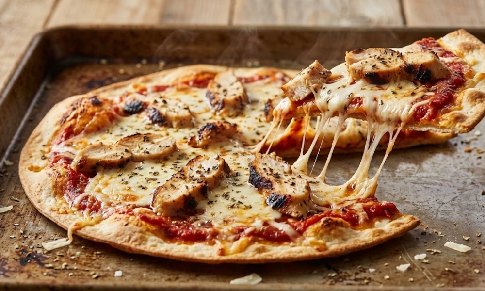 Premažite paradajz sosom, poređajte komadiće barene ili pečene piletine, malo mocarele i origana. Zapecite u rerni 5-7 minuta dok se sir ne istopi.